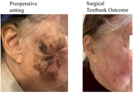 In contrast, if only one comprehensive outcome measure is reported, it could more accurately and informatively reflect the actual level of therapy success and morbidity. Therefore, the idea of putting all individual parameters into one composite measure has been proposed, naming it “Textbook Outcome”. The definition of a Textbook Outcome (TO) includes a list of specific criteria, for example: R0-margins and lack of serious complications, which—pooled together—represent an ideal outcome of the surgery. In other words, a TO represents a state when “everything goes well” in the process of surgical treatment. For illustration, an example of a TO in a patient with locally advanced melanoma of the face is shown in Figure 2. The main principle of the TO is that specific criteria (which may vary between distinct definitions) are required for the achievement of the TO. If they are all met simultaneously, the TO is attained. Otherwise, if any of the criteria has not been met, there is no TO.