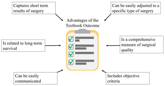 The strength of the TO over other composite quality measures is its ability to easily adapt to any procedure, as the definition of a TO is based on expert opinion [27]. This allows for quick implementation of the TO in any field of surgery. Furthermore, the TO is informative for patients, providing them with a straightforward probability of a favorable course of surgical treatment [28]. This makes the TO easy to communicate. Furthermore, despite capturing mainly short-term results, a TO also has prognostic value, as it translates into long-term survival outcomes. As it was shown in the context of several different cancers, patients who achieve TOs have a favorable prognosis over those who do not achieve TOs [29,30,31,32]. Also, the TO is an objective measure, and therefore it can be used for benchmarking [33].