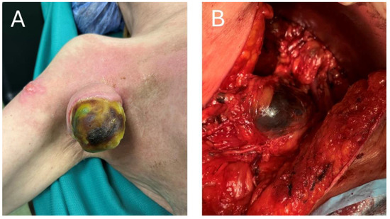 (A) Exophytic melanoma tumor after neoadjuvant immunotherapy. (B) Intra-operative view of metastatic melanoma tumor post neoadjuvant ICI treatment.