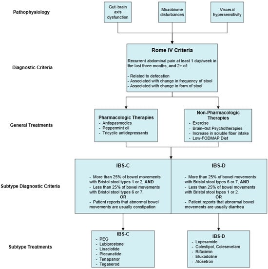IBS prevalence is influenced by demographic factors, with women more commonly affected than men and higher rates observed in younger adults compared to those over 40 years of age [6,7,8]. Psychological disorders, such as anxiety and depression, are strongly associated with IBS, and while socioeconomic status (SES) is also considered a risk factor, findings are mixed, with both higher and lower SES linked to increased risk in different studies [9,10,11,12]. A meta-analysis conducted in 2011 estimated the global prevalence of IBS to be approximately 11.2%, but more recent systematic reviews utilizing the Rome IV criteria suggest a lower, though still significant, prevalence of 3.8% [13,14]. Despite these findings, IBS remains a chronic condition that is incapacitating for many and imposes a significant burden on the healthcare system. In the United States, IBS is associated with increased healthcare costs, accounting for 25–50% of referrals to gastroenterologists, and is the second-leading cause of work absenteeism [15,16]. As such, it is imperative for healthcare providers to develop an effective therapeutic alliance with their patients to foster a trusting relationship that encourages open communication. Since the presentation of IBS is highly variable, and the mainstay of treatment is alleviating symptoms rather than curing a pathophysiologic process, care should be individualized to address the specific IBS subtype and symptom profile of each patient. We aim to evaluate the current strategies in the management of IBS, focusing on both pharmacologic and non-pharmacologic approaches, and how they are utilized to treat the various subtypes of this disease.