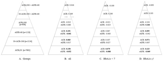 The relationship between TyG index values and ACR and eGFR values in the groups specified in Pyramid (A). Pyramid (B) shows the correlation coefficient (r) for the entire sample across each group. Pyramid (C) presents the correlation coefficient (r) for individuals with HbA1c values < 7 in each group. Pyramid (D) displays the correlation coefficient (r) for individuals with HbA1c values ≥7 in each group. The coefficients that were determined to be statistically significant (p < 0.05) are highlighted in bold. eGFR: estimated glomerular filtration rate; ACR: albumin/creatinine ratio.
