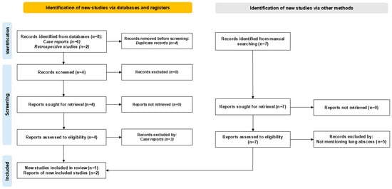 A systematic literature search was conducted in accordance with the Preferred Reporting Items for Systematic Reviews and Meta-Analyses (PRISMA) guidelines to ensure methodological rigor, transparency, and reproducibility throughout the review process. The search included articles published in the PubMed database from January 2020 to the present, with a supplementary manual search undertaken to identify any additional pertinent studies potentially omitted in the primary database search. The grey literature, including theses, dissertations, and conference proceedings, was excluded from this review to prioritize peer-reviewed, published studies. Figure 1 shows the search results using the PRISMA diagram.
