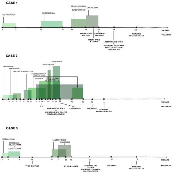 Antibiotic treatment used, ICD and lavage duration, discharge, and follow-up in all three cases.