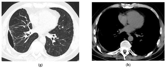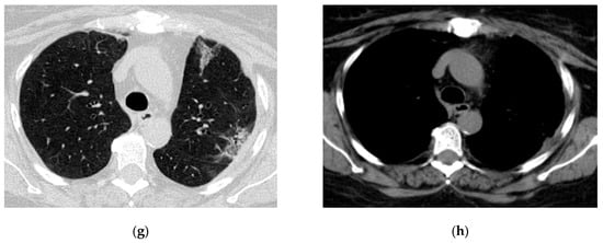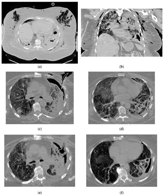 Pneumologists and intensive care specialists treated the patients until the lung abscesses were complicated with pleural empyema, and thoracic surgeons were involved in the treatment. Due to the severity of the COVID-19 pulmonary damage and the severe respiratory insufficiency, major surgery (lung resection, decortication of the lung) was contraindicated, and the therapeutic management of all cases was conservative. A percutaneous intracavitary drainage (ICD) was inserted, and lavage of the pleural cavity with isotonic saline solution through the inserted drainage was initiated as soon as the bronchopleural fistula was no longer manifest. In some cases, multiple chest tube insertions were mandatory to reach the entire empyema cavity. In all cases, after initiation of this treatment, the clinical course gradually improved due to the rapid control of the purulent infection. Parallel to that, radiologic regression of the pulmonary infiltrates and gradual functional recovery were noticed. The evolution of the purulent cavity (lung abscess and pleural empyema) was documented by serial CT scans, and the local and systemic treatment was adapted as necessary. The outcome of all patients was favorable, finally allowing the suppression of the ICD. Figure 3, Figure 4 and Figure 5 showcase the evolution of purulent infection under the conservative treatment, offering insight into this treatment method.