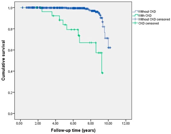 In the statistical analysis, both the mean and median were used to describe the central tendency of continuous variables. The mean was applied to normally distributed data, providing the average value, while the median was used for non-normally distributed data, reflecting the midpoint of the dataset with the 5th to 95th percentile range. To compare continuous variables between groups, two statistical tests were employed: Student’s t-test and the Wilcoxon rank-sum test. The t-test was used for normally distributed data to compare the means between two groups. For non-normally distributed data, the Wilcoxon rank-sum test (a non-parametric alternative) was applied to compare the medians, as it does not assume a normal distribution. Pearson’s chi-square test was the statistical test for categorical data. Binary logistic regression method was used to assess the relationship between a binary outcome (presence or absence of CKD) and one or more independent variables (e.g., cardiovascular risk factors, age, BMI, or blood test variables). The logistic regression model estimated the odds ratio (OR) for each independent variable, representing the odds of the outcome occurring in relation to the exposure. The results were presented as adjusted ORs with 95% confidence intervals (CIs) to indicate the strength and direction of associations. Multivariable logistic regression was performed to adjust for potential confounding variables, such as age, gender, and other relevant risk factors. The Kaplan–Meier log rank test was used to analyze the time until cardiovascular death occurred. Meanwhile, Cox regression survival analysis was used for investigating the effect of several variables upon the time cardiovascular death took place. In the univariate analysis, one parameter was varied at a time, whilst in the multivariate analysis, the variables that were significant in the univariate analysis were varied simultaneously. Cox regression generated hazard ratios (HRs) which were interpreted with a 95% CI. In. A p-value of <0.05 was considered statistically significant. Statistical Package for the Social Sciences (SPSS 24, Chicago, IL, USA) was used for data analysis.