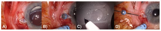 In the Carlevale group, corneal markings were made on the 0° and 180° axes, and the conjunctiva was opened peritomically in these areas. Two scleral flaps were prepared in line with the corneal markings. At a distance of 1.8 mm from the limbus, 2 sclerotomies were made under the scleral flaps using a 25-gauge lance, and the corresponding trocars were placed (Figure 2A,B). To ensure better visualization and reliable verification of the correct orientation of the IOL during capture and externalization of the proximal haptic, the edge of the leading transscleral plug was marked, which should be oriented superiorly after implantation (Figure 2C). The Carlevale IOL was injected into the anterior chamber using an injector through the sclerocorneal tunnel. The first haptic was grasped with forceps and externalized under the scleral flap. Then, the second haptic was grabbed using the handshake technique and also externalized (Figure 2D). Finally, the scleral flaps, sclerocorneal tunnel, and conjunctiva were closed with an absorbable 8–0 suture.