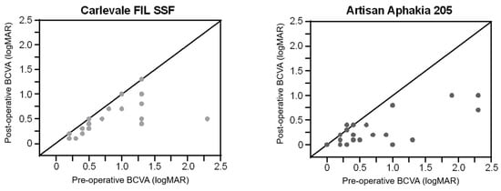 Preoperative best-corrected visual acuity (BCVA) versus postoperative BCVA (logMAR) for the Artisan group and Carlevale group. The line of equality represents no change in the BCVA, with points below the line indicating an improvement in the BCVA and points above the line indicating a decline in postoperative BCVA.