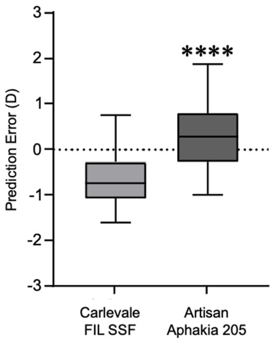 The deviation of the postoperative prediction error was −0.67 ± 0.56 in the Carlevale group and 0.34 ± 0.71 in the Artisan group, a statistically significant difference (p < 0.0001) (Figure 4). Six weeks postoperatively, 28% of the Carlevale group had a deviation of a maximum of ± 0.5 D from the target refraction, compared to 42% of the cases in the Artisan group (Figure 5). The mean incision-suture time was 42.5 ± 5.8 min in the Carlevale group and 28.2 ± 6.4 min in the Artisan group (Figure 6).