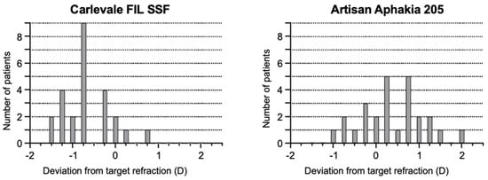 In terms of the refractive outcomes, the Artisan group showed significantly better results, as evidenced by the lower deviation of the postoperative spherical equivalent from the preoperative target refraction (Artisan group: 0.34 ± 0.71 D compared to Carlevale group: −0.67 ± 0.56 D). These results align with the findings of other studies, where the mean deviation in the Carlevale group was −0.46 ± 1.35 D and in the Artisan group it was 0.08 ± 1.60 D (p = 0.019) [14].