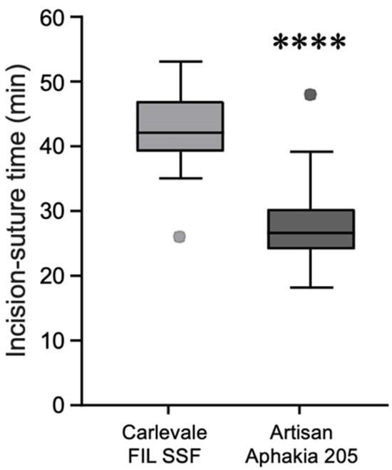 Box plots of the incision-suture times for the Carlevale FIL SSF and the Artisan Aphakia 205 IOLs (**** = p < 0.0001, Mann–Whitney U test).