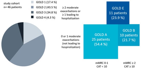 The basic characteristics of the participants are shown in Table 1 and Figure 2. The study population comprised 46 patients (52.2% females) with a median age of 69 ± 8 years. Most patients had a moderate airway obstruction according to GOLD grades 2 and 3 (78.3% of all patients). The distribution of GOLD grades and groups is given in Figure 2.