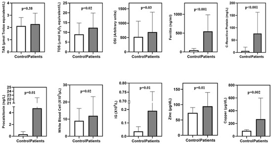 The TAS, TOS, OSI, and biochemistry values of the controls and patients are shown in Table 1. There was no statistically significant difference in age (p = 0.290) or gender distribution (p = 0.185) between the control and patient groups. In terms of diseases, there was no statistically significant difference between the groups (p > 0.05). No significant difference was observed in TAS between controls (2.13 ± 0.69) and patients (2.27 ± 0.89) (p = 0.380). The TOS was significantly higher in the patient group (13.4 ± 7.5) compared to controls (1.8 ± 4.4) (p = 0.021). TOS > 12.00 means a “very high oxidant level” (kit manufacturer information). OSI was significantly higher in the patient group (689.8 ± 693.9) compared to the control group (521.7 ± 546.6) (p = 0.035). Ferritin levels were significantly higher in the patient group (546.5 ± 440.8 ng/mL) compared to controls (45.5 ± 46.5 ng/mL) (p < 0.001). CRP levels were significantly higher in the patient group (76.6 ± 85.9 mg/L) compared to the control group (5.6 ± 15.1 mg/L) (p < 0.001). PCT levels were significantly higher in the patient group (15.8 ± 8.6 ng/L) compared to the control group (2.3 ± 7.2 ng/L) (p = 0.012). The WBC count was significantly higher in the patient group (18.0 ± 5.9 × 103/μL) compared to the control group (7.9 ± 2.0 × 103/μL) (p = 0.025). IG counts were also higher in the patient group (0.19 ± 0.56 × 10⁹/L) compared to the control group (0.04 ± 0.04 × 10⁹/L) (p = 0.013). Zinc levels were significantly higher in the patient group (86.1 ± 21.0 µg/dL) compared to the control group (66.5 ± 15.9 µg/dL) (p = 0.012). Copper levels were also significantly elevated in the patient group (243.7 ± 90.2 µg/dL) compared to the control group (77.2 ± 17.2 µg/dL) (p = 0.002) (Table 1, Figure 1).