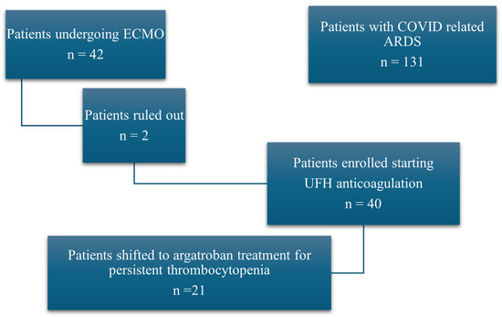 All patients enrolled in the study entered into the UFH group (treated with unfractionated heparin from the beginning of the ECMO run). In case of a platelet count drop to values below 100,000 cells/mm3, heparin was suspended and replaced with argatroban, thus making the involved patient(s) leave the UFH group to enter the ARG group (treated with argatroban until weaning from ECMO or until death).