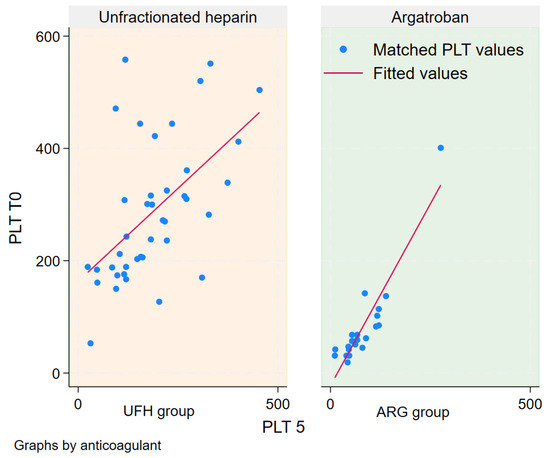 A linear regression analysis of PLT T5 as a dependent variable, with PLT T0 and the anticoagulant used as independent variables, indicated that PLT T5 depended on PLT T0 but not on the type of anticoagulant (p = 0.001, CI: 0.55, 0.69 and p = 0.078, CI: −3.51, 64.5; Table 4 and Figure 2).