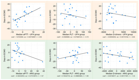 Linear regression between days in ECMO and the aPTT, PLT, and D-dimer in both groups—light orange for the UFH group and light green for the ARG group. ECMO = extracorporeal membrane oxygenation.