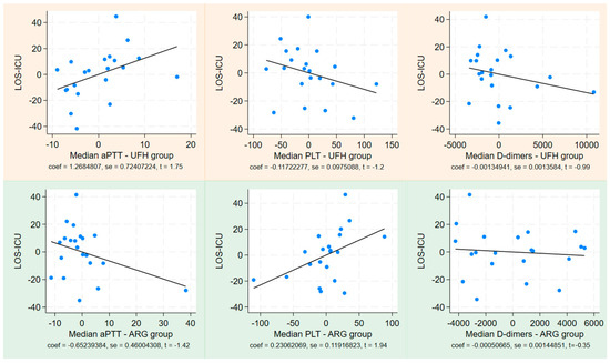 Linear regression between LOS-ICU and PTT, PLT, and D-dimer in both groups—light orange for the UFH group and light green for the ARG group. aPTT = activated prothrombin time, PLT = platelet, UFH = unfractionated heparin, ARG = argatroban, LOS-ICU = length of stay in intensive care unit.