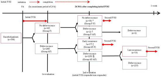 A Febrile status was defined as an axillary temperature of 37.5 °C or higher. All enrolled patients were divided into the following four groups based on their febrile status at two time points (immediately after the completion of the initial IVIG treatment and again 24–36 h after completing the initial IVIG treatment) (Figure 1): Group F-F, patients remained febrile at both time points (n = 38); Group F-AF, patients were febrile at the end of the initial IVIG treatment but became afebrile 24–36 h later (n = 2); Group AF-F, patients were afebrile at the end of the initial IVIG treatment but were febrile 24–36 h later (n = 37); and Group AF-AF, patients were afebrile at both time points (n = 229).