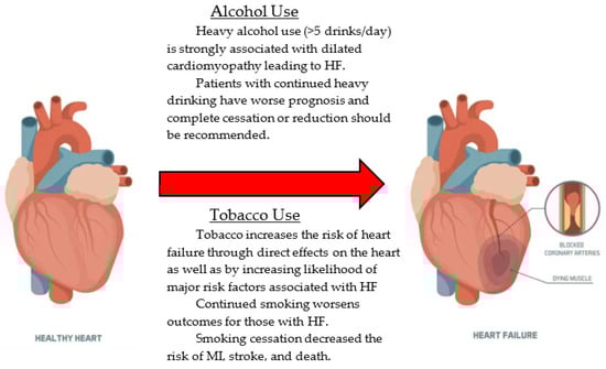 Substance use, particularly alcohol, tobacco, cannabis, and cocaine, is strongly linked to the onset and progression of HF. Moderate alcohol may reduce the incidence of heart failure, but heavy alcohol usage (>5 drinks per day) is strongly associated with dilated cardiomyopathy [27]. In addition, tobacco usage also increases the risk of heart failure by increasing the risk of coronary artery disease (CAD), along with other comorbidities that contribute to CAD, including hypertension, diabetes mellitus, and hyperlipidemia [5,28]. Smoking has a direct effect on the heart as the chemicals that are inhaled damage the blood vessels and form plaque in the coronary arteries, leading to CAD. Figure 1 below summarizes the effects of smoking and alcohol as well as the benefits of smoking and alcohol cessation.