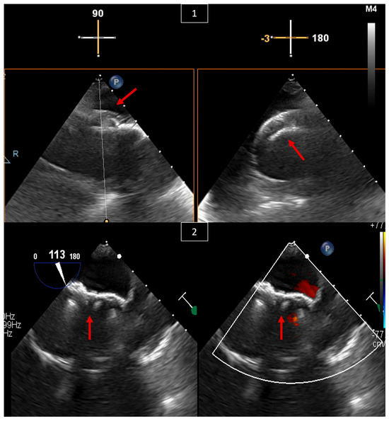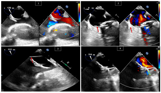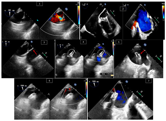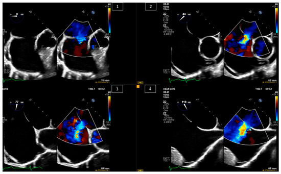 Many adult patients with congenital heart disease undergo valve replacement surgeries during their lives. One of the complications of such surgeries is paravalvular leak. Paravalvular leak is not uncommon; it has been reported in up to 18% of patients in the aortic valve position and in 23% in the mitral valve position [27,28]. Patients who have an indication for reintervention, such as severe symptomatic paravalvular regurgitation or hemolysis associated with paravalvular regurgitation [29,30], nowadays have the option of surgical or percutaneous intervention, with the latter being a lower-risk procedure that has been shown to be effective [31,32]. These procedures necessitate the guidance of TEE to guide the catheter and device into the paravalvular area and decide the size of the device to be used, as well as to check the final result and residual leaks (Figure 7).