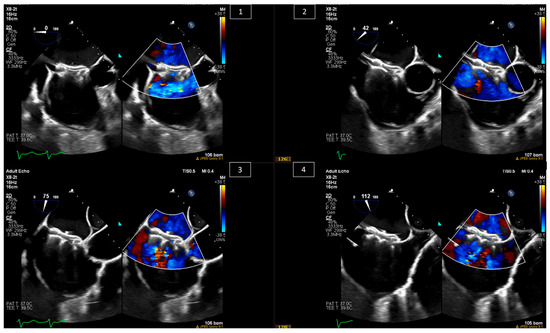 TEER is being widely studied and used for the treatment of mitral regurgitation in patients without congenital heart disease [20,21,22,23]. This use has expanded, and studies show the feasibility of the technique in surgical high-risk patients with congenital heart disease who have a systemic atrioventricular valve (AVV) other than the classical mitral valve, and develop severe systemic atrioventricular valve regurgitation. Such patients include those with congenitally corrected transposition of the great arteries (ccTGA), transposition of the great arteries with surgical atrial switch and systemic tricuspid valve regurgitation, or functional single ventricles with systemic AVV regurgitation [24,25,26]. Indications for intervention are beyond the scope of this article. The importance of TEE is to confirm the indication for and feasibility of the procedure by measuring the size of the atria, guiding the interatrial puncture when needed, and guiding the clipping device on the intended leaflets and its interaction with nearby structures (Figure 6).