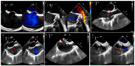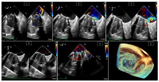 Paravalve leak plugging in a 51-year-old male with symptomatic paravalve leak. (1–3) Looking at the posterior paravalve area and the leak at different angles, with and without color Doppler—0 degrees in (1), 42 degrees in (2), and 79 degrees in (3). The intervention. (4) Guiding the wire across the paravalve leak and confirming its position with and without color Doppler. (5) Seeing the catheter inside the paravalve leak area with color Doppler. (6) The catheter (red arrow) in the paravalve leak area in 3D.