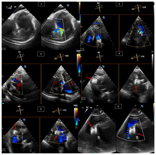 TEE of a percutaneous muscular VSD closure in a 54-year-old male with symptomatic significant left-to-right shunt. (1) Transgastric view of the muscular VSD with and without color Doppler showing left-to-right shunt. (2) X-plane on the defect with color Doppler at different angles to decide on the best angle for guiding the intervention. (3) X-plane of a transgastric view with color Doppler showing the wire (red arrow) across the VSD at 75 and 165 degrees. (4) X-plane of a transgastric view showing the VSD closure device (red arrow) in position and still attached to the wire at 80 and 170 degrees. (5) The same view from (4), now with color Doppler showing no residual left-to-right shunt. (6) Transgastric view at 55 degrees with color Doppler showing the VSD closure device (red arrow) after release in a stable position.