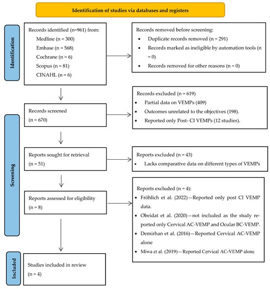 A total of 51 full-text records were sought for retrieval, of which 43 studies were excluded for lacking comparative data between different types of VEMPs. Eight full-text studies were assessed for eligibility and, during this evaluation, four studies were further excluded for reporting either AC-VEMP or BC-VEMP data alone without the necessary comparative context. Consequently, a total of four full-text articles met the inclusion criteria and were included in the final review. The screening, selection, and inclusion processes are illustrated in the PRISMA flowchart (Figure 1).