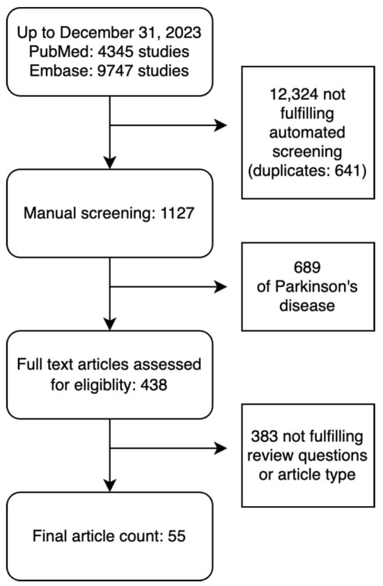 The search strategy identified 14,092 studies published from 1990 to 2023. The automated title screener screened out a total of 12,324 studies without errors detected upon manual review. A manual screening of the remaining 1127 articles found 689 of PD, and an additional 383 abstracts, review articles, or studies not meeting review questions. Full-text assessment for eligibility resulted in 55 articles which met the review criteria (Figure 1) and underwent data extraction as well as quality and risk of bias appraisal. There were 13 articles on ataxia [,,,,,,,,,,,,], 11 articles on chorea [,,,,,,,,,,], five articles on dystonia [,,,,], one article on tics [], and 25 articles on tremor [,,,,,,,,,,,,,,,,,,,,,,,,]. No articles on myoclonus were included. Thirty-five studies used machine learning (ML), sixteen used deep learning (DL), and four used both. The total number of subjects included was 11,946. For each hyperkinetic movement disorders group, ataxia had 2492 cases and 644 controls; chorea had 5256 cases and 271 controls; dystonia had 659 cases and 380 controls; tics had 11 cases with no controls; and tremor had 1540 cases and 693 controls. Data analyzed included 17 kinematics datasets (e.g., accelerometers, inertial measurement units), 15 studies included imaging-based datasets (e.g., MRI, fMRI, DAT scan), 12 studies included voice or video datasets (e.g., voice analysis, video analysis, eye tracking), and 10 studies included electrophysiology datasets (e.g., EEG, EMG), while the remainder included clinical examination and genetic datasets.