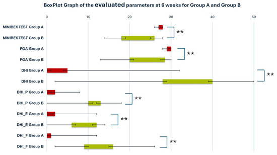 Boxplot graph of the evaluated parameters at 6 weeks for Group A and Group B. ** Statistically significant difference. Red boxes: Group A, green boxes: Group B.