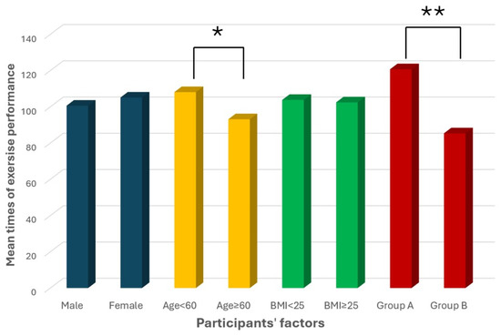 Mean times of exercise performance vs. participants’ factors. * Suggestive of statistical difference. ** Statistically significant difference.