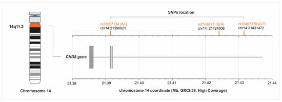 Location of the CHD8 gene’s single nucleotide polymorphisms (SNPs) on chromosome 14 (GRCh38). The figure was created on the basis of data from LDmatrix Tool [12].