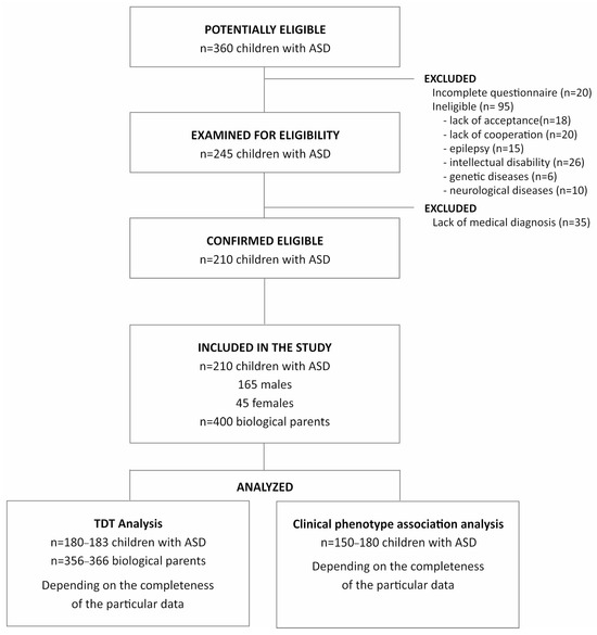 The study group comprised 210 children with idiopathic ASD and their biological parents. Patients enrolled included 165 males (78.64%) and 45 (21.36%) females (mean age 7.26 ± 2.72). All participants were Caucasians and inhabitants of Upper Silesia (southwestern region of Poland). Subjects were recruited between 2016 and 2019 at the Department of Pediatric Neurology (John Paul II Upper Silesian Child Health Centre, Katowice, Poland), the Child Development Support Center, and the Psychiatric Daily Ward for Children and Adolescents in Gliwice. The diagnosis was made by a psychiatrist specializing in autism spectrum disorders. The ADOS-2 (Autism Diagnosis Observation Schedule) protocol was used to confirm the diagnosis of ASD [13]. In addition to the diagnosis of autism, the inclusion criterion was age ranging from 3 to 12 years. Exclusion criteria were as follows: epilepsy, intellectual disability, and other genetic and neurological diseases. A flow chart of patient selection is presented in Figure 2.