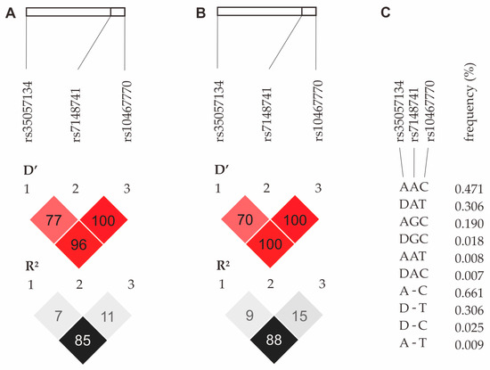 - Machiela, M.J.; Chanock, S.J. LDlink: A web-based application for exploring population-specific haplotype structure and linking correlated alleles of possible functional variants. Bioinformatics 2013, 31, 3555–3557. [Google Scholar] [CrossRef]