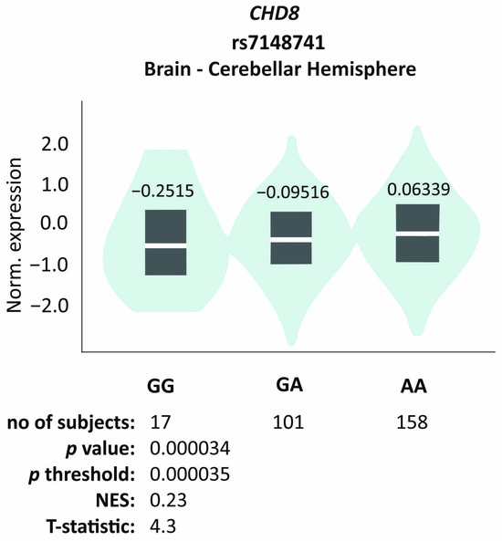 The eQTL analysis revealed that only the rs7148741 variant affects gene expression in the cerebellar hemisphere tissue (p = 0.000034, NES = 0.23, T = 4.3; Figure 4). The functional impact of the missense variant rs10467770 was predicted by three algorithms: SIFT, PolyPhen-2, and CADD. This variant overlaps 14 transcripts, and for 2 of them only one algorithm predicted pathogenicity (i.e., probably damaging, SIFT score = 0.05, or deleterious, PolyPhen score = 0.987). Overall, it might suggest that the variant is more likely to be benign.
