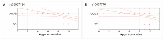 The distribution of Apgar score values with respect to rs35057134 (A) and rs10467770 (B) polymorphisms. Legend: D, deletion allele, squares—cases, Continuous line—regression line, Dashed line—confidence interval.