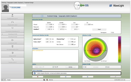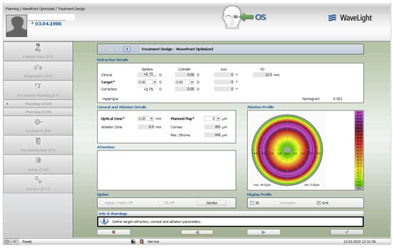 The treatment consisted of corneal surface excimer laser ablation aiming for normalization using a topography-guided platform (Software: Contura, Version 2.0-Alcon/Wavelight, Erlagen, Germany). A 6 mm optical zone was chosen in all cases, as seen and described in Figure 1. The epithelial removal was accounted for by adding an additional −2.75 diopter correction to the topography-guided normalizing surface ablation—seen in Figure 2. The first excimer treatment described above was followed by a second wavefront-optimized hyperopic excimer treatment of +2.75 diopters with a 6 mm optical zone, as seen in Figure 3, to account for the residual epithelial removal at an 8.5 mm diameter. The two sequential excimer ablations were followed by corneal crosslinking (CXL). This revised treatment protocol negated the use of two treatment cards—an excimer treatment necessity for all excimer lasers in the USA—one for the Contura topography-guided platform treatment. The Contura topography-guided software, version 2.0 is FDA approved only for myopic treatments in the US and used off-label in our “US Athens Protocol” described herein. The second excimer laser application was a wavefront-optimized hyperopic treatment (WFO) with the same optical zone of 6 mm. Following the two sequential ablations, we used saline-diluted riboflavin (1%) for soaking for five minutes, and then 6 mW/cm2 of UV light were applied for 15 min utilizing the PXL Platinum 330 device (Peschke MedTech, Germany), in continuous mode (without pulsing) and without supplemental oxygen.