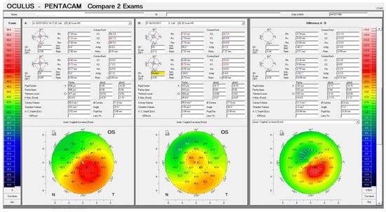 The preoperative patient data and results are summarized in Table 1. Figure 1 illustrates a Contura treatment designed with zero refraction. Figure 2 illustrates that same example treatment with an additional −2.75 diopters of myopia to account for central epithelial removal as this first excimer treatment was applied on the intact epithelium. Figure 3 illustrates the wavefront-optimized +2.75 hyperopic treatment that was used as a second step to account for additional epithelial removal for a total diameter of 8.5 mm. Figure 4 depicts sequential Scheimpflug tomography assessments as an example from this case series: the preoperative axial/sagital curvature tomography map and keratometry data is shown in A, the respective postoperative results are shown in B, and the difference map, A-B (preoperative minus the postoperative), on the right. Figure 5 illustrates 3-month postoperative total corneal and epithelial thickness mapping at 9 mm diameter, as measured by anterior segment OCT (Optovue, CA, USA). The image illustrates the “deep” CXL line, as well as the epithelial remodeling that we have long reported that is indicative of the stabilization of the cornea.
