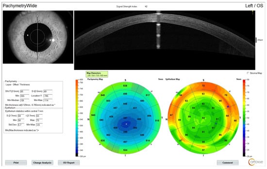 An example case imaged postoperatively after 3 months using anterior segment OCT (Avanti, Optovue, CA, USA) documenting the deep CXL line visualized in the example case at a 9 mm corneal diameter, as well as the respective epithelial remodeling—as we have reported—that may be indicative of ectasia stabilization.