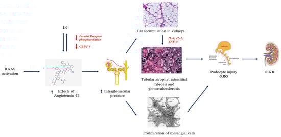 Obesity is linked to increased metabolic and hemodynamic demands on the kidneys [,,]. This occurs through heightened vascular permeability due to arteriolar vasodilation, which in turn leads to upregulation of RAAS. Consequently, the raised sodium reabsorption in the proximal convoluted tubule (PCT) increases the risk of hypertension [,,] and proteinuria [,,,]. This risk is also exacerbated by glomerular hyperfiltration due to sodium accumulation, resulting in hemoconcentration in the post-glomerular region [,]. Hyperfiltration is closely associated with glomerulomegaly, which can ultimately lead to focal segmental glomerulosclerosis (FSGS) []. This mechanism creates a vicious cycle, where glomerular damage promotes further afferent arteriolar vasodilation, which in turn drives efferent arteriolar vasoconstriction []. Additionally, angiotensin II, the primary effector of the renin–angiotensin–aldosterone system (RAAS), contributes to a chronic state of inflammation and oxidative stress. It acts both as a growth factor and as a pro-inflammatory cytokine, exacerbating KD []. RAAS upregulation, leading to an imbalance between elevated levels of angiotensin II and the ACE2/Ang (1–7) axis, is also linked to deterioration of the metabolic profile, particularly in glucose metabolism. Overexpression of angiotensin II stimulates the production of pro-inflammatory adipokines, which impair the function of glucose transporter 4 (GLUT4) and hinder insulin receptor phosphorylation, further compromising glucose homeostasis [].