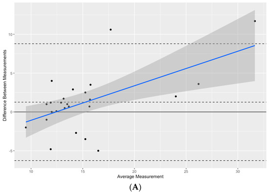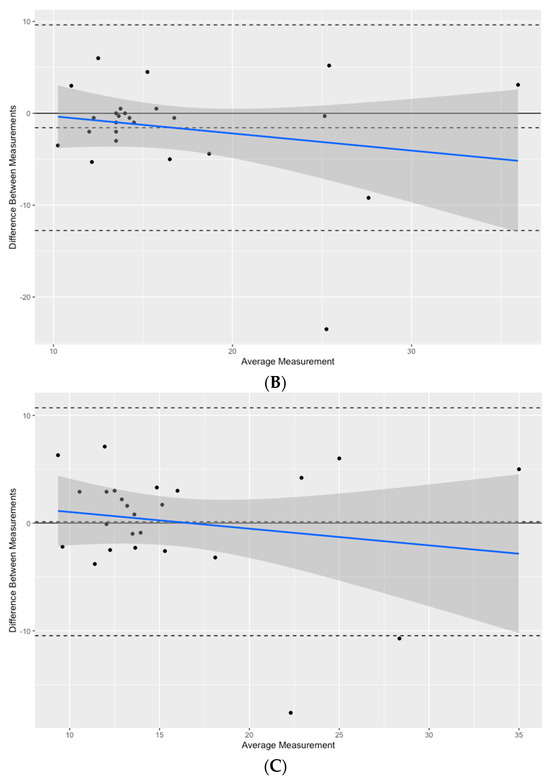 Figure 1A presents the Bland–Altman plot illustrating the agreement between GAT-IOP and iCare. On average, the iCare measurements were slightly higher than GAT-IOP, showing a bias of 1.26 ± 3.8 mmHg SD with a 95% confidence interval (CI) ranging from −0.32 to 2.84 mmHg, indicating potential variability. However, this difference was not statistically significant (p = 0.1138) The limits of agreement (LoA) ranged from −6.26 mmHg to 8.78 mmHg. The relatively wide spread of 15.05 mmHg between the upper and lower LoA indicates considerable variability between individual measurements. This suggests that while the methods generally agree, the differences can be substantial for certain measurements, particularly at extreme values. Finally, evidence of proportional bias is indicated by the slope of the regression line in Figure 1A: at lower IOP values (less than 14 mmHg), the iCare measurements were generally lower than GAT-IOP, while at higher IOP values, the iCare readings tended to be higher than GAT-IOP.