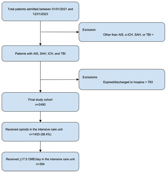 This retrospective observational study was conducted in the neurointensive care unit of a single tertiary care center. The study population consisted of 2490 patients, admitted between January 2021 and December 2023 with a primary diagnosis of acute ischemic stroke (AIS), intracerebral hemorrhage (s-ICH), subarachnoid hemorrhage (SAH), or traumatic brain injury (TBI). Patients were included if they were 18 years or older and had complete data for the variables of interest. This study was conducted in a 413-bed academic medical center, a Level I trauma center, and a comprehensive stroke center. Notably, no specific institutional protocols were in place for prescribing opioids to patients in the neurocritical care unit. The attending neurointensivist made these decisions at their discretion, based on individual patient assessments and clinical judgment. The absence of specific protocols allowed for a real-world exploration of clinical practices.