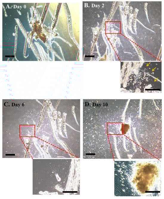 Cell proliferation in scraped DP tissues attached to the culture dish surface. (A) Image of the scraped DP tissues cultured in MEMα/10% FBS. Images were captured on the day of scratching (designated day 0). (B) Image of scraped DP tissue cultured on day 2. Cell outgrowth (arrows) was first observed. (C) Image of scraped DP tissues cultured on day 6. Cells proliferated radially around the DP tissue. (D) Image of scraped DP tissue cultured on day 10. The cells were allowed to reach confluence. Scale bar, 100 μm. DP cells from No. 12 were used (see Table 2 for details).