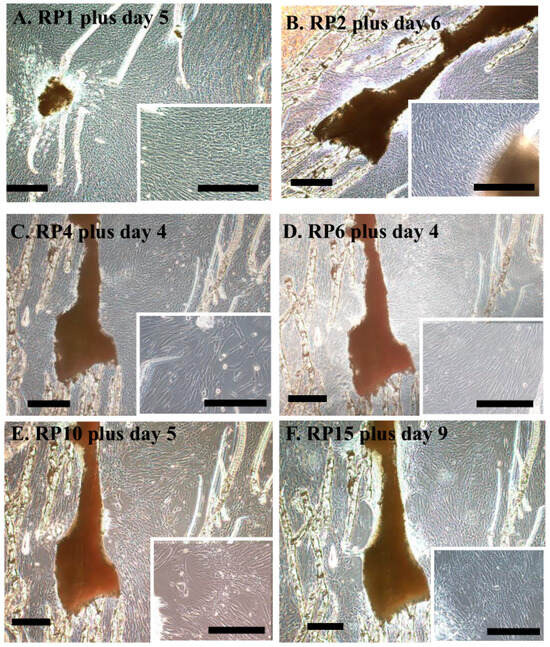 Time required to reach ≥ 80% confluence following repeated passage (RP). (A) Cells reached confluence on day 5 after RP1. (B) Cells reached confluence on day 6 after RP2. (C) Cells reached confluence on day 4 after RP4 treatment. (D) Cells reached confluence on day 4 after RP6 treatment. (E) Cells reached confluence on day 5 after RP10 treatment. (F) Cells reached confluence on day 9 of RP15 treatment. Scale bar, 100 μm. RP, repeated passage. DP cells from No. 12 were used (see Table 2 for details).