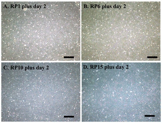 Subculture after repeated passage (RP). The cells obtained at (A) RP1, (B) RP6, (C) RP10, and (D) RP15 were re-plated onto 60 mm gelatin-coated culture dishes, and reached confluence 2 days after seeding. However, the number of cells derived from RP15 cells was low. Scale bar, 100 μm. DP cells from No. 12 were used (see Table 2 for details).