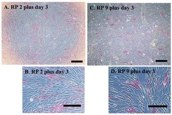 Cytochemical staining for alkaline phosphatase. (A,C) ALP-stained cells with phase images. Cells were subjected to ALP staining three days after RP2 and RP9. (B,D) High-magnification-rate phase images. Scale bar, 100 μm. DP cells from No. 12 were used (see Table 2 for details).