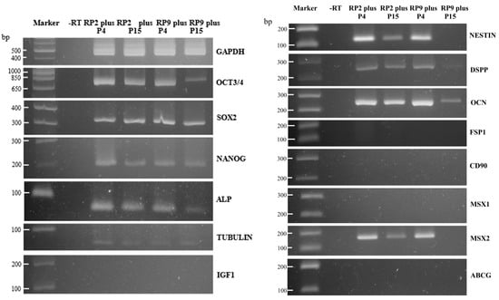 RT-PCR analysis of stem cell-related gene expression in HDDPCs. The RT-PCR products obtained from HDDPCs that underwent four cell passages after PR2 are designated RP2 plus P4. Similarly, cells that underwent 15 passages after PR2 and 4 passages after RP9 or 15 passages after RP9 were designated as RP2 plus P15, RP9 plus P4, and RP9 plus P15, respectively. GAPDH, glyceraldehyde-3-phosphate dehydrogenase; OCT3/4, octamer-binding protein 3/4; SOX2, SRY-box transcription factor 2; NANOG, Nanog homeobox; ALP, Alkaline phosphatase; TUBULIN, Tubulin; IGF1, insulin-like growth factor 1; NESIN, nestin; DSPP, dentin sialophosphoprotein; OCN, osteocalcin; FSP1, fibroblast-specific protein 1; CD90, cluster of differentiation 90; MSX1, Msh homeobox 1; MSX2, Msh homeobox 2; ABCG, ATP-binding cassette subfamily G; -RT, negative control (water was used for PCR). DP cells from No. 12 were used (see Table 2 for details).