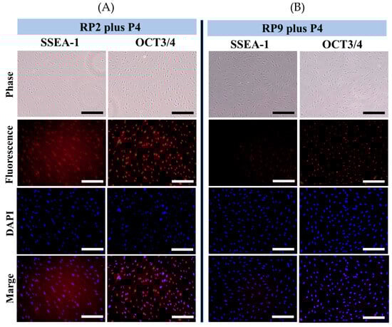 When immunocytochemical analysis was performed on cells obtained after RP, the fluorescence intensity was higher in cells treated at RP2 plus P4 compared to those at RP9 plus P4 (Figure 7). In particular, a significant reduction in SSEA-1 expression was observed in cells treated at RP9 plus P4. However, OCT3/4 expression was maintained in both the RP2 plus P4 and RP9 plus P4 groups.
