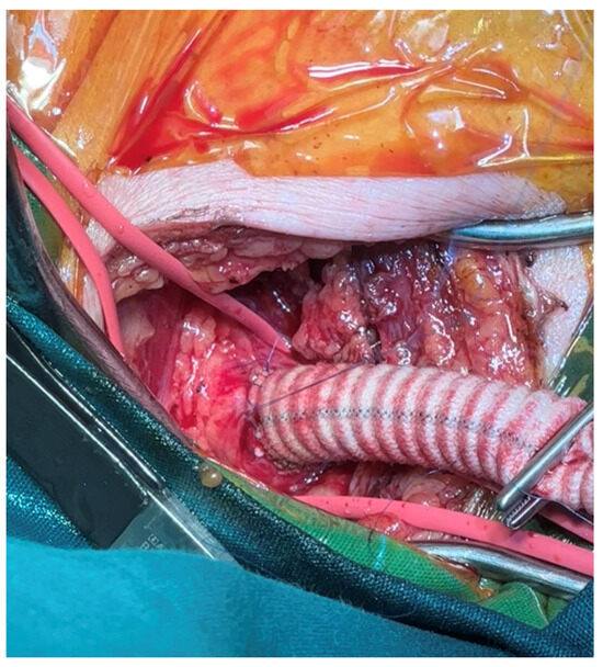 In chronic dissections, where the flap seems to be more rigid, many surgeons avoid oversizing, preferring to size the graft based on the maximum diameter of the true lumen, while in aneurysms, most surgeons agree on 10–20% oversizing, at about the level of the distal landing zone. Regarding the stent length, the risks related to endoleaks, associated with shorter stent lengths, must be counterbalanced with the risk of paraplegia brought on by longer stent lengths. Our approach is aligned with that of most centres on this matter, which dictates the use of a shorter device, accepting the risk of an endoleak and possible reintervention in the future [31]. As such, we opt to use a 100 mm graft and anastomose in zone 2, securing the stented part of the prosthesis above the level of the seventh thoracic vertebra (Th7); when a longer stent is required, we usually prefer to proceed with a second-stage endovascular procedure. Regardless of the graft’s size, a thorough assessment of the preoperative computed tomography angiogram is imperative [27].