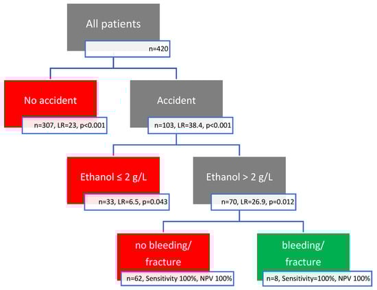 Via chi-square recursive partitioning analysis, we created the Munich cCT Rule for intoxicated patients. It starts with the variable with the highest likelihood ratio (accident) and continues excluding low risk patients until the target sensitivity and NPV of 100% are not reached anymore. The resulting Munich cCT Rule for intoxicated patients states that patients with recreational drug or ethanol poisoning are at risk for fracture/bleeding if the conditions poisoning, accident, and ethanol > 2 g/L are all met (n = 70). All other intoxicated patients were not at risk (n = 350). It excluded fracture/bleeding and neurosurgical intervention with a sensitivity of 100% (CI 95% 60–100%) and an NPV of 100% (CI 95% 98.6–100%) for fracture/bleeding and a sensitivity of 100% (CI 95% 19.8–100%) and an NPV of 100% (CI 95% 98.6–100%) for neurosurgical intervention (Table 5, Figure 1).
