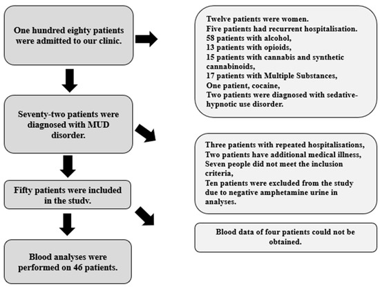 This study was carried out on 50 individuals between the ages of 18 and 50 who were diagnosed with MUD and tobacco use disorder (TUD) according to DSM-5 and 50 smoking controls (SCs) diagnosed with TUD and 50 nonsmoking (NSC) male individuals in the same age range who were treated at the Adult Detoxification Centre (ADC) of the Sakarya Training and Research Hospital (STRH) in Türkiye. The control group was voluntarily formed from individuals with similar demographic characteristics who live in the same region as the patients. Research indicates that substance use is predominantly observed in males, and sex-related differences can impact the transcription of monoamine transporters. Consequently, this study was designed to focus solely on male participants, thereby ensuring a homogeneous group for analysis [26,27]. Ethical approval was obtained from the Sakarya University Faculty of Medicine Clinical Research Ethics Committee with the number E-16214662-050.01.04-208337.